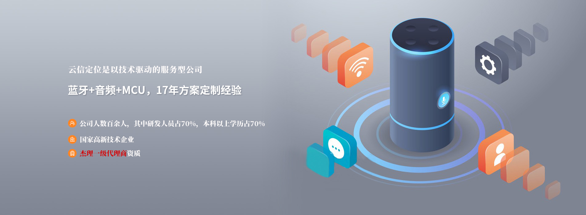 深圳市云信通訊技術有限公司是一家以技術為核心,專注于杰理芯片供應以及整體解決杰理方案的國家高新技術企業。作為杰理科技的一級代理商和方案商,我們提供杰理藍牙產品線,包括杰理芯片,杰理語音芯片,杰理BLE芯片,杰理藍牙wifi芯片,杰理音頻解碼芯片等全系產品,擁有多項產品認證和20余項目專利以及軟件著作權。